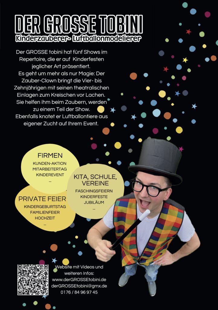 derGROSSEtobini bietet eine faszinierende Zaubershow, die das Publikum begeistert und unterhält. Mit seiner charmanten Persönlichkeit und seiner interaktiven Show sorgt er für eine unvergessliche Erfahrung für seine kleinen ZuschauerInnen.